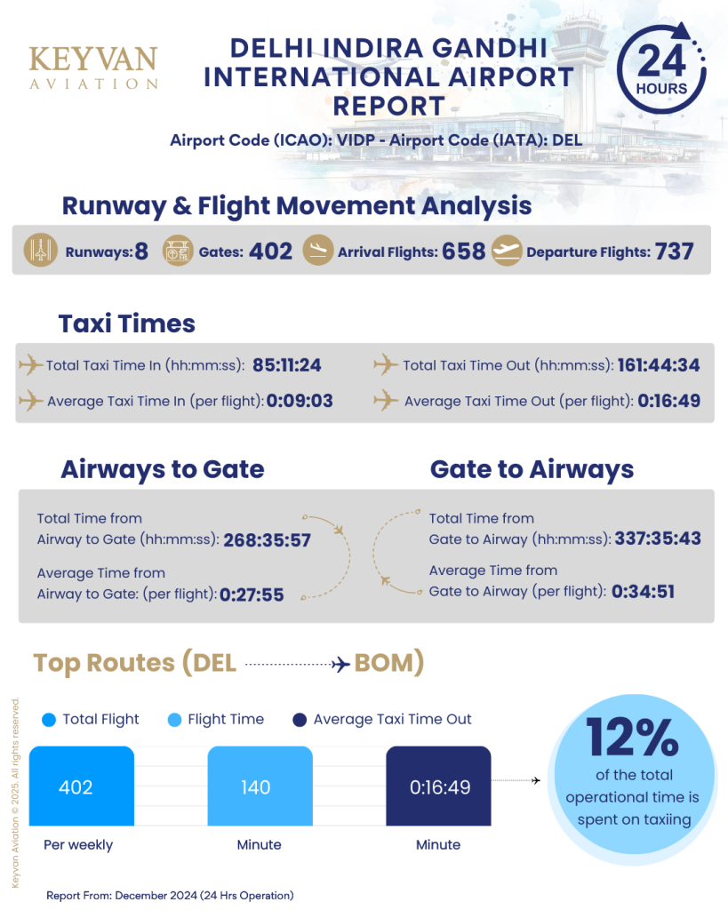 On the busiest route, Delhi to Mumbai, there were 402 flights (per weekly), each averaging 140 minutes of flight time. The average taxi-out time was 17 minutes (per flight). Efficient operations are crucial; however, taxiing accounted for 12 % of the total operational time.