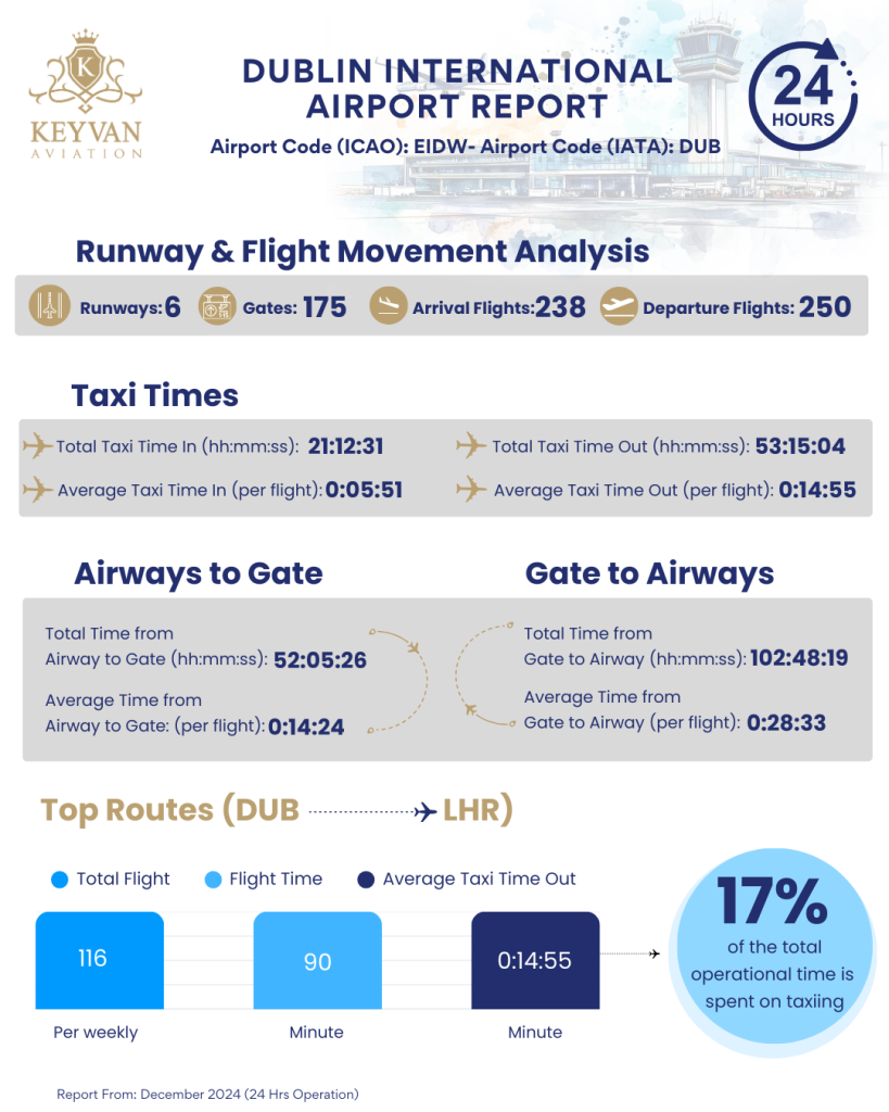 Our latest report covers 24 hours of operation in December 2024 and provides a detailed one-day analysis of operational efficiency. In just 24 hours, Dublin International Airport handled 238 arrival flights and 205 departure flights. On the busiest route, Dublin to Londra, there were 116 flights (per weekly), each averaging 90 minutes of flight time. The average taxi-out time was 14 minutes (per flight). Efficient operations are crucial; however, taxiing accounted for 17% of the total operational time.