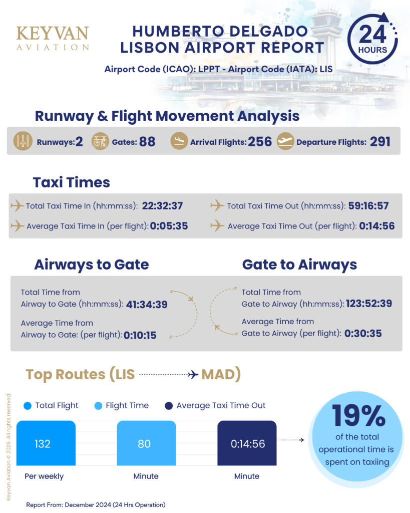 In just 24 hours, Humberto Delgado Lisbon Airport handled 256 arrival flights and 291 departure flights.On the busiest route, Lisbon to Madrid, there were 132 flights (per weekly), each averaging 80minutes of flight time. The average taxi-out time was 15 minutes (per flight). Efficient operations are crucial; however, taxiing accounted for 19% of the total operational time.
