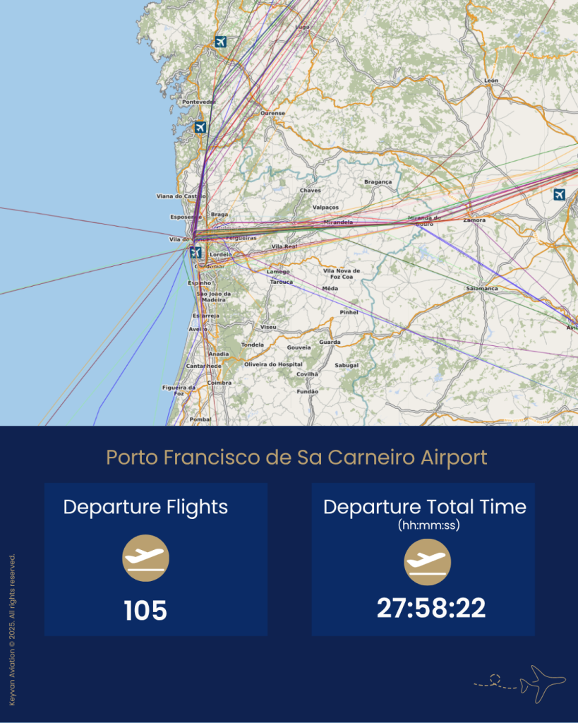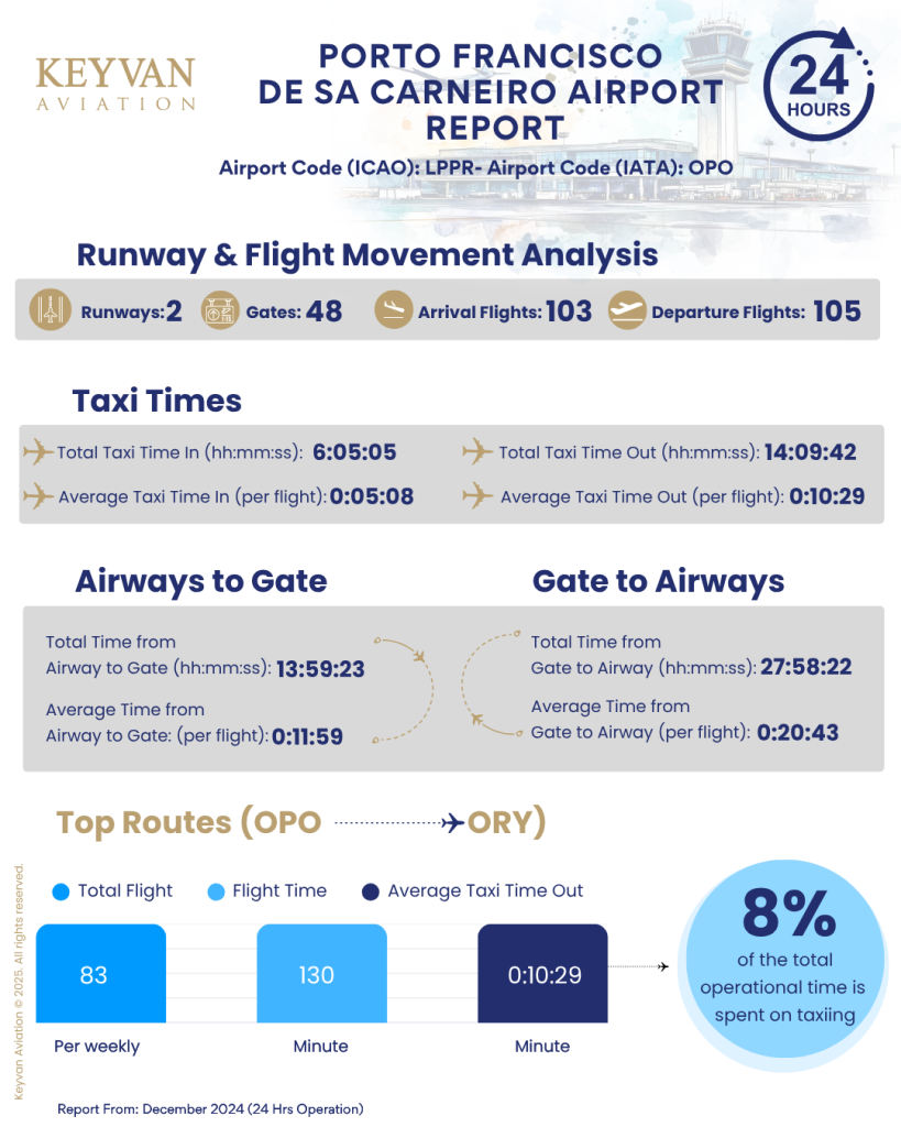 On the busiest route, Porto to Paris, there were 83 flights (per weekly), each averaging 130 minutes of flight time. The average taxi-out time was 10 minutes (per flight). Efficient operations are crucial; however, taxiing accounted for 8% of the total operational time. This week, we analyze Porto Francisco de Sa Carneiro Airport (OPO) Report with key operational data, including:
