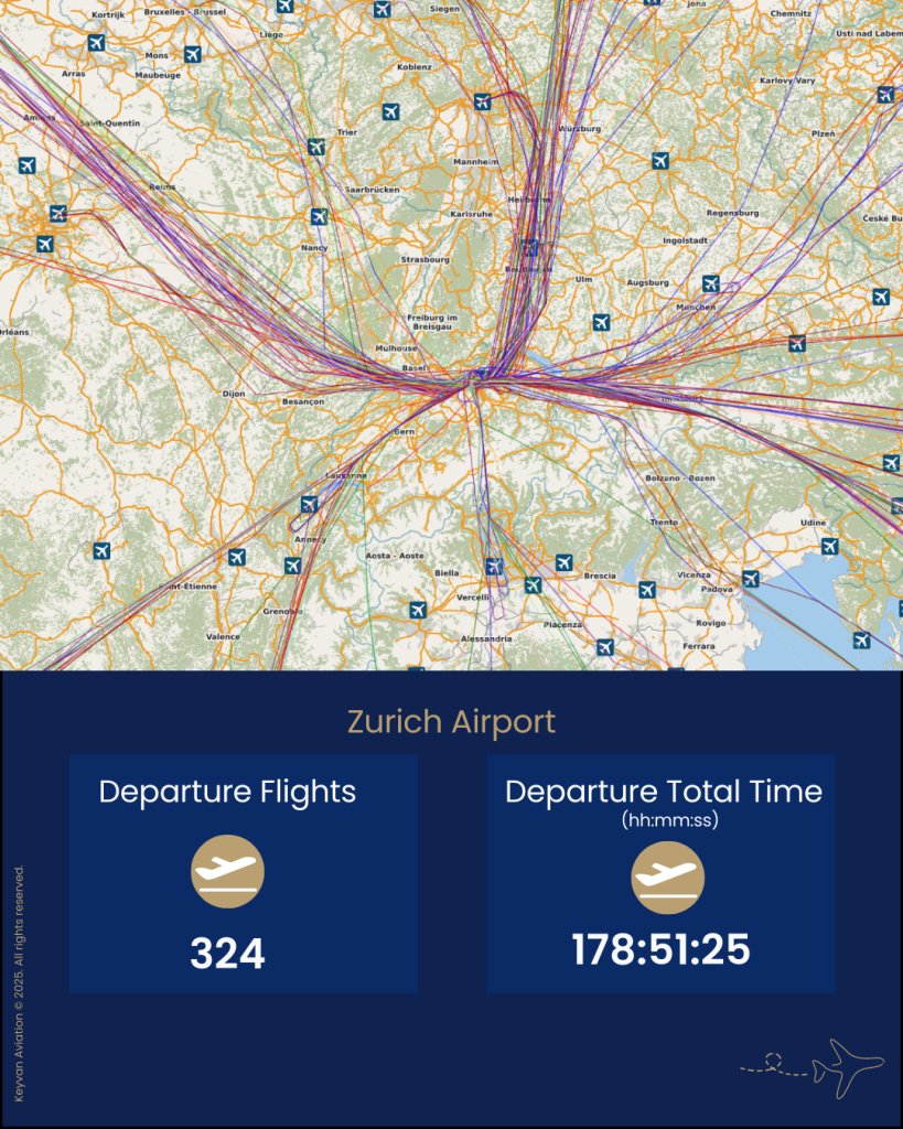 On the busiest route, Zurich to Londra, there were 110 flights (per weekly), each averaging 90 minutes of flight time. The average taxi-out time was 34 minutes (per flight). Efficient operations are crucial; however, taxiing accounted for 32% of the total operational time.